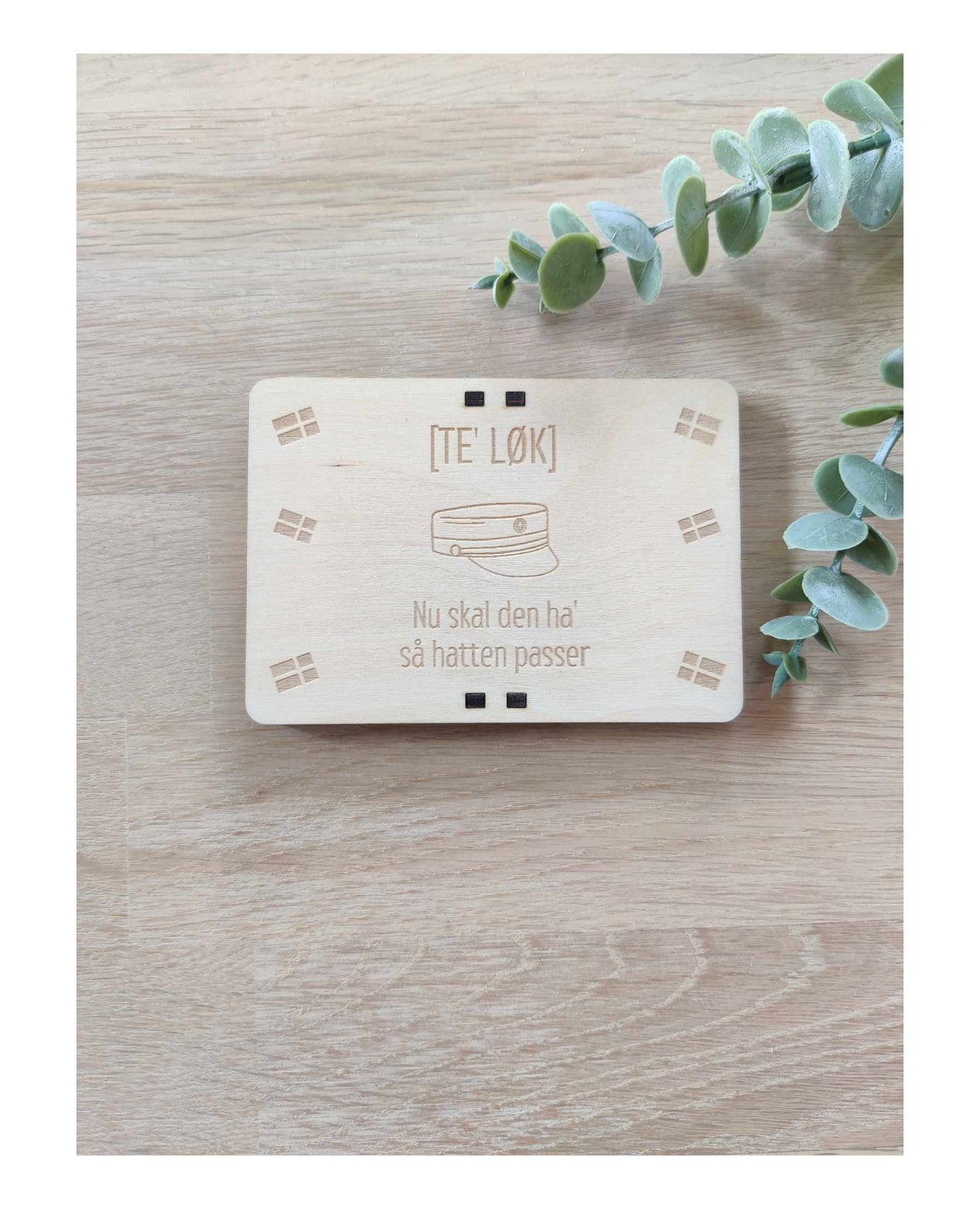 • Graveret tekst: [TE* LØK] Nu skal den ha’ så hatten passer