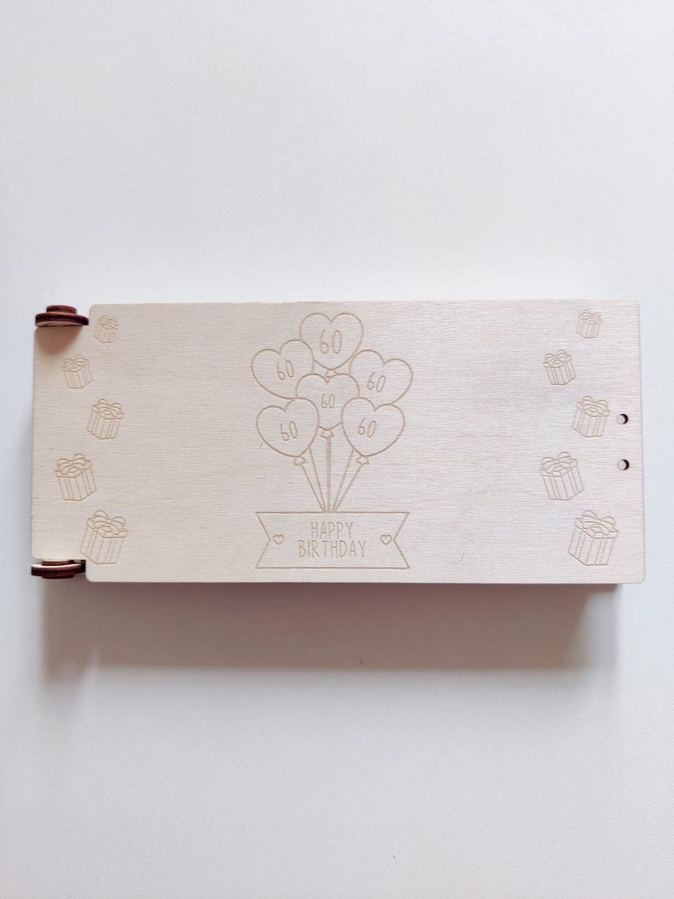 - Graveret dekoration: Balloner med tallet 60 graveret i