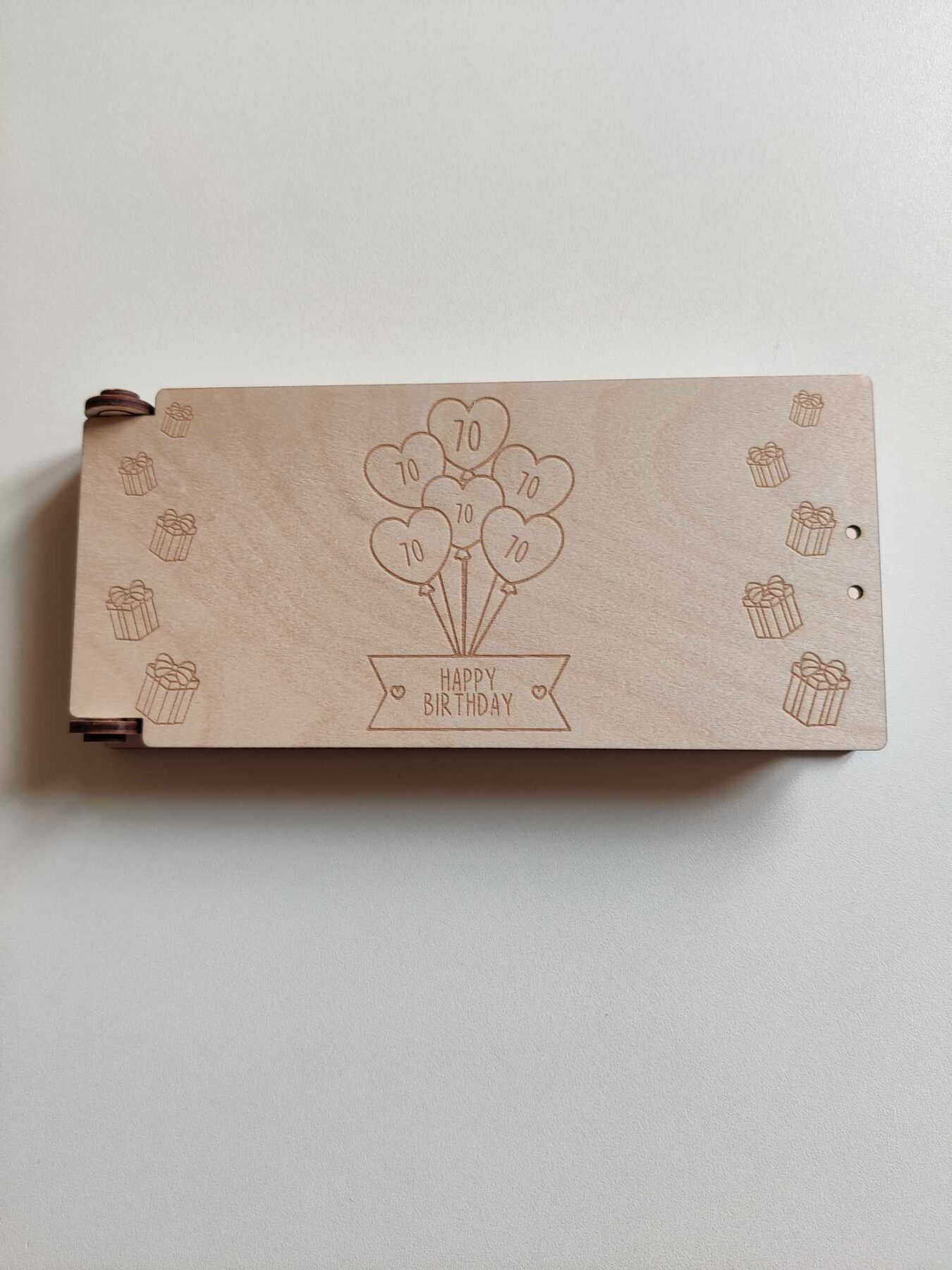 - Graveret dekoration: Balloner med tallet 70 graveret i