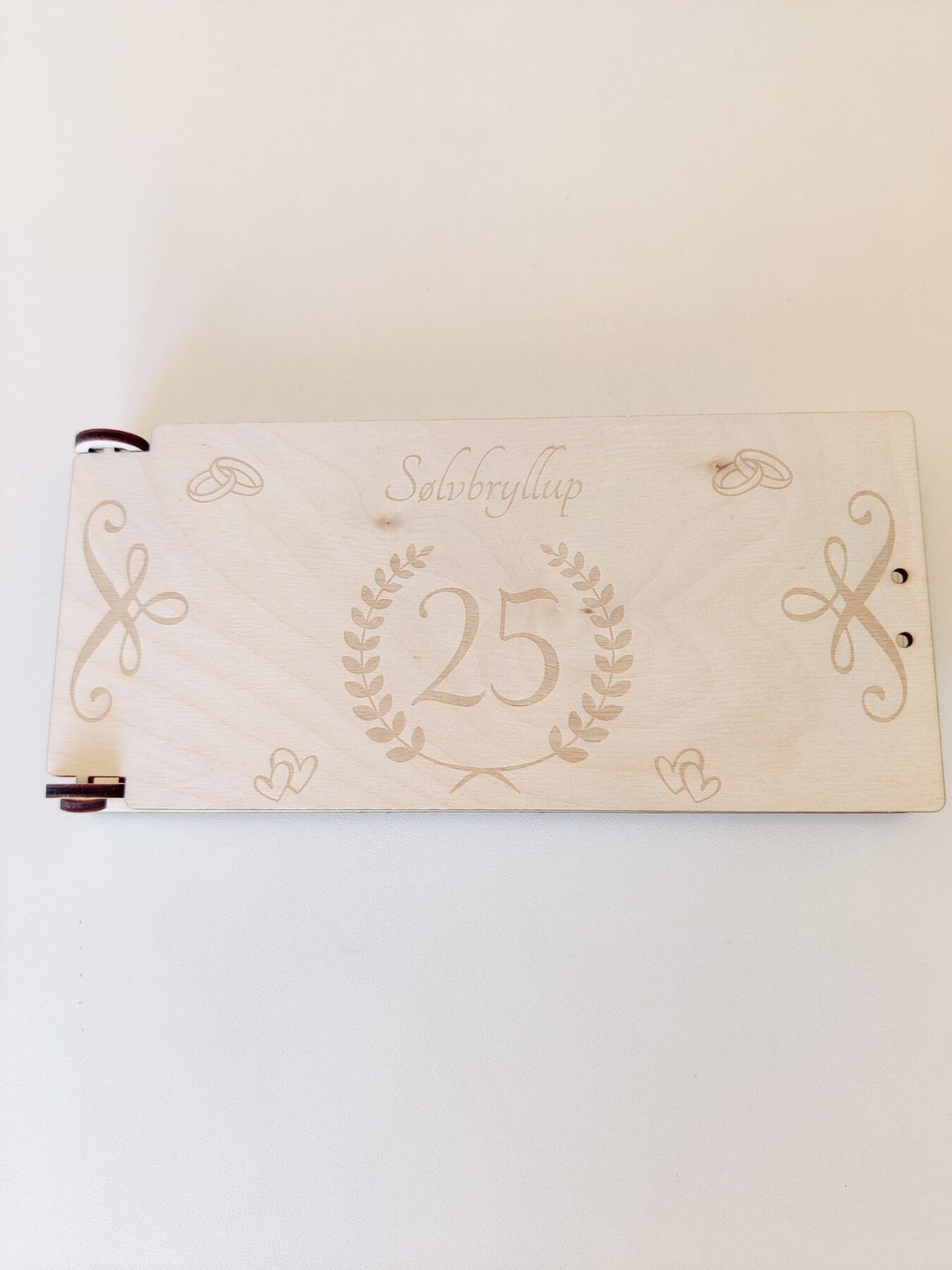 - Graveret dekoration: Krans med 25, ringe, hjerter og swirls
