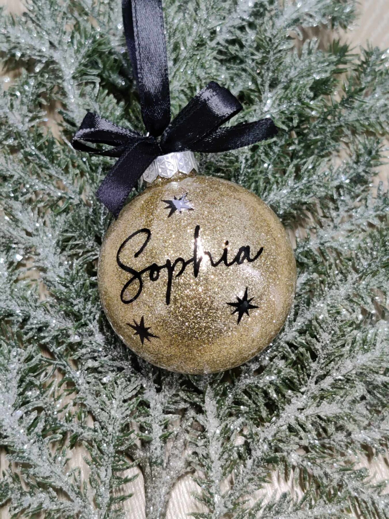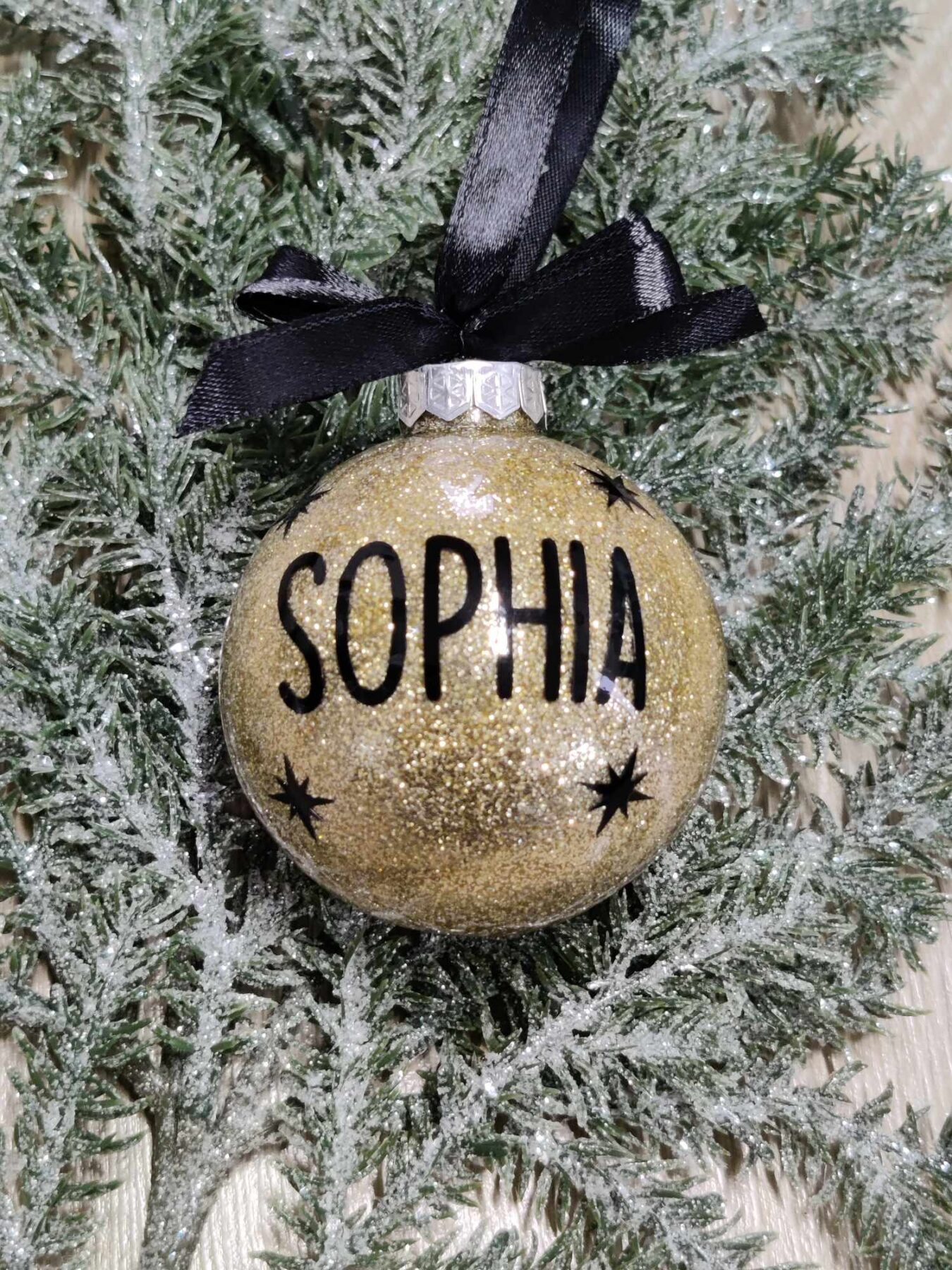 Julekugle med guld glimmer og navn.