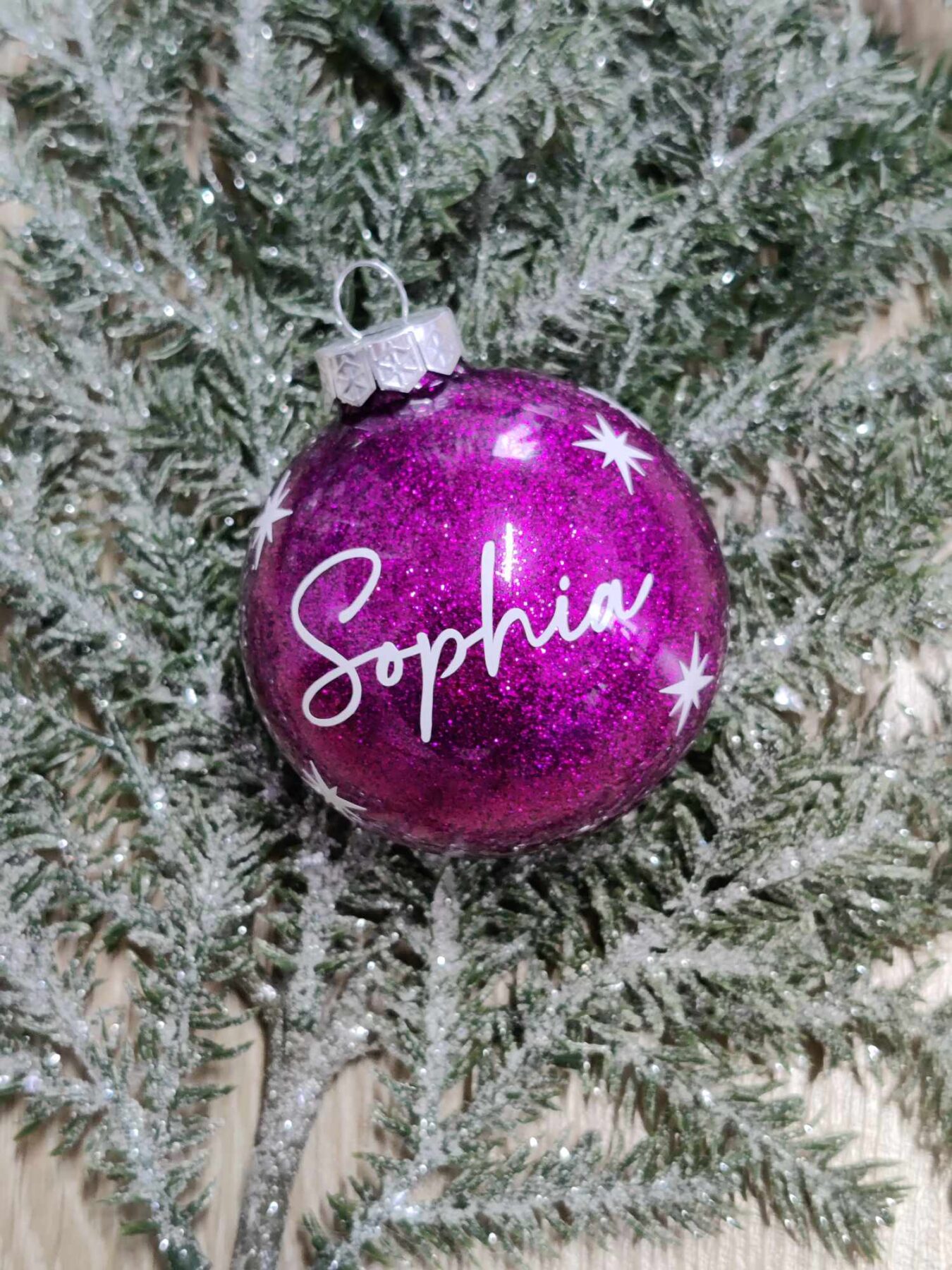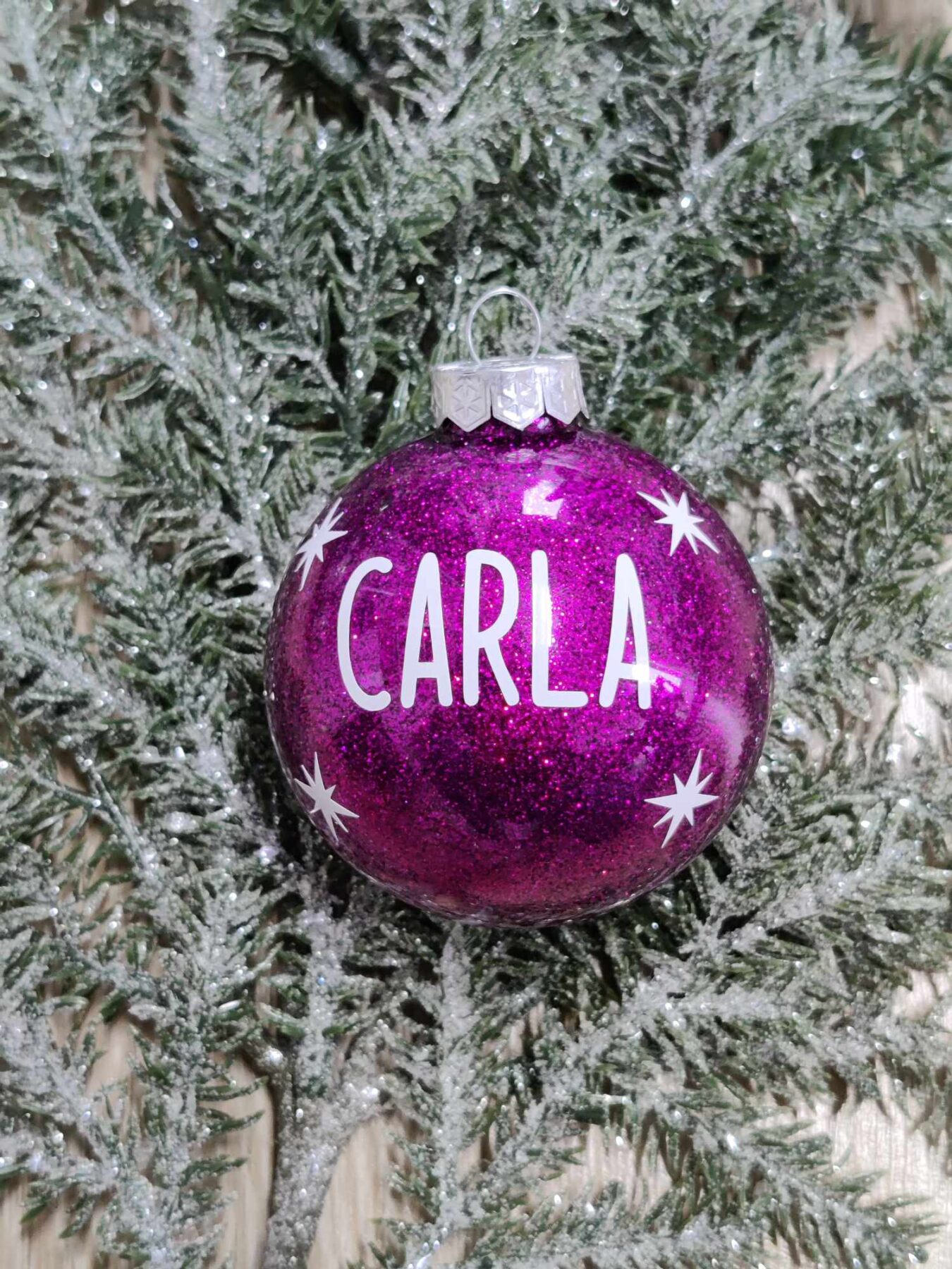 Julekugle med mørklilla glimmer og navn.