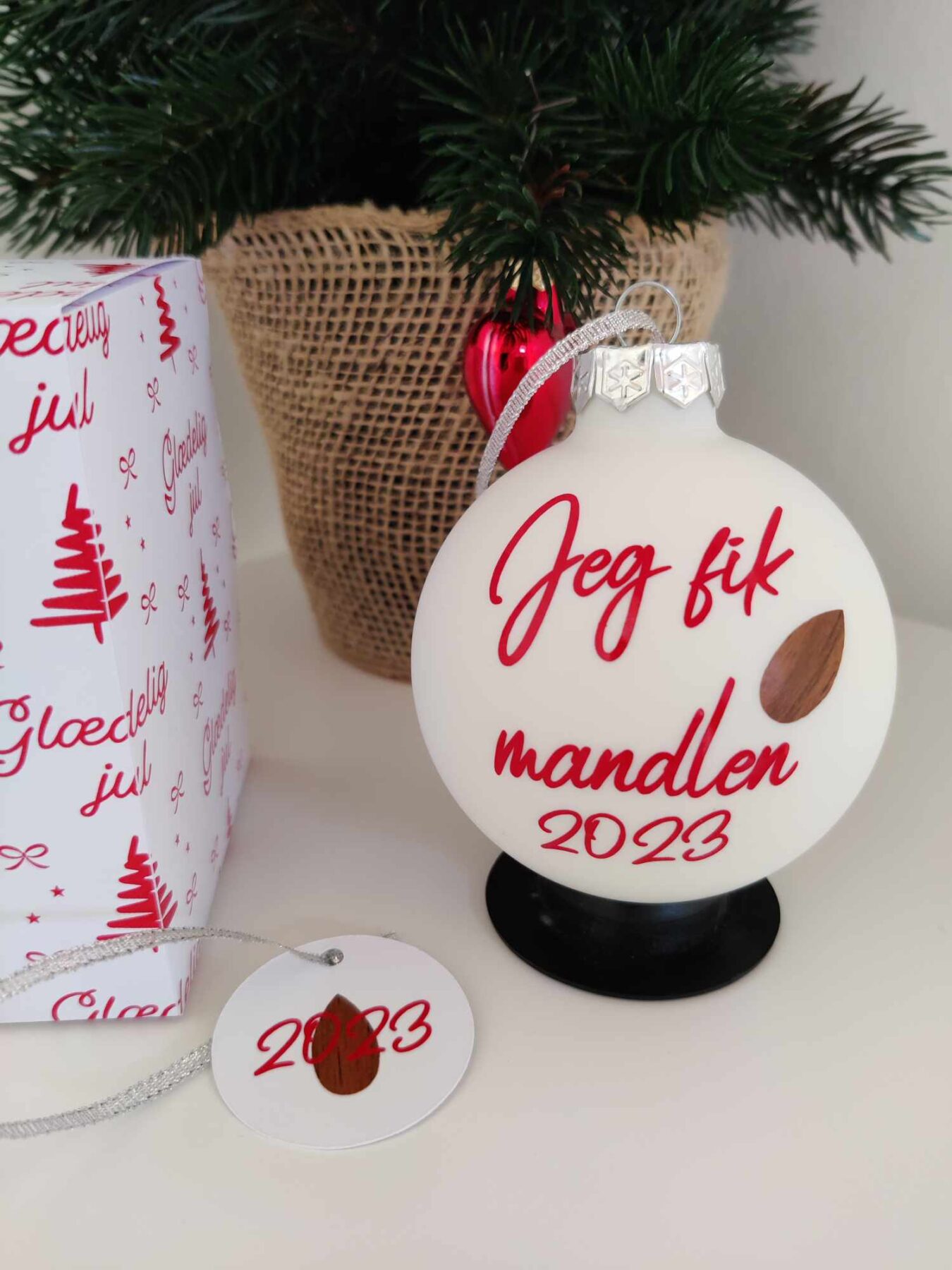 Den legendariske “Jeg fik mandlen” julekugle laves på en hvid glaskugle som er 8 cm stor.