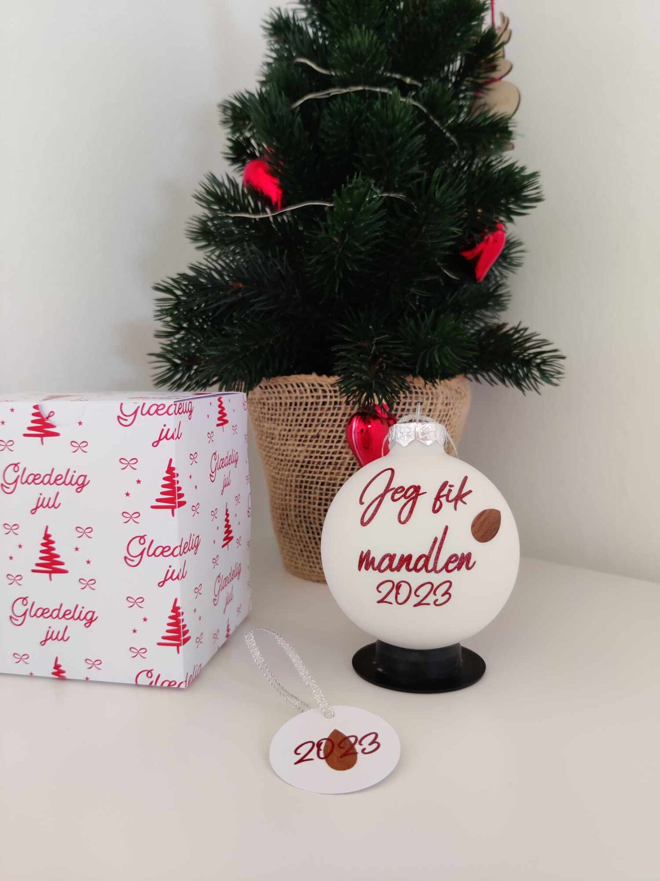 Den legendariske “Jeg fik mandlen” julekugle laves på en hvid glaskugle som er 8 cm stor.