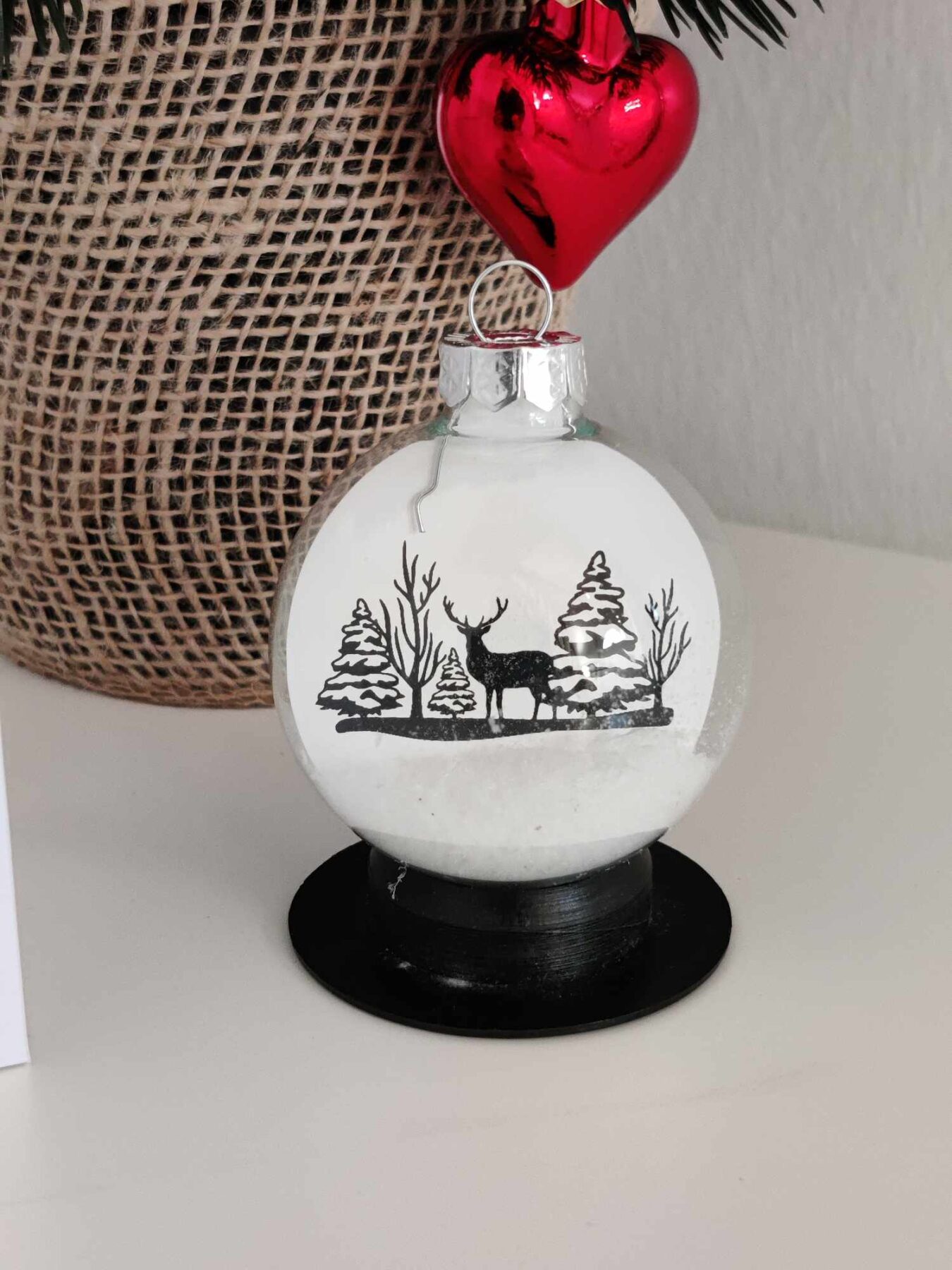 Det søde julemotiv som er sat ned indvendig i kuglen, fuldendes med sne i bunden af kuglen.