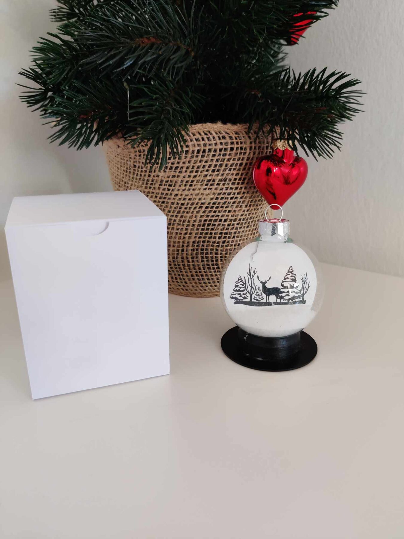 Julekuglen findes i størrelserne 6 og 8 cm kugle. og der følger en hvid gaveæske med.