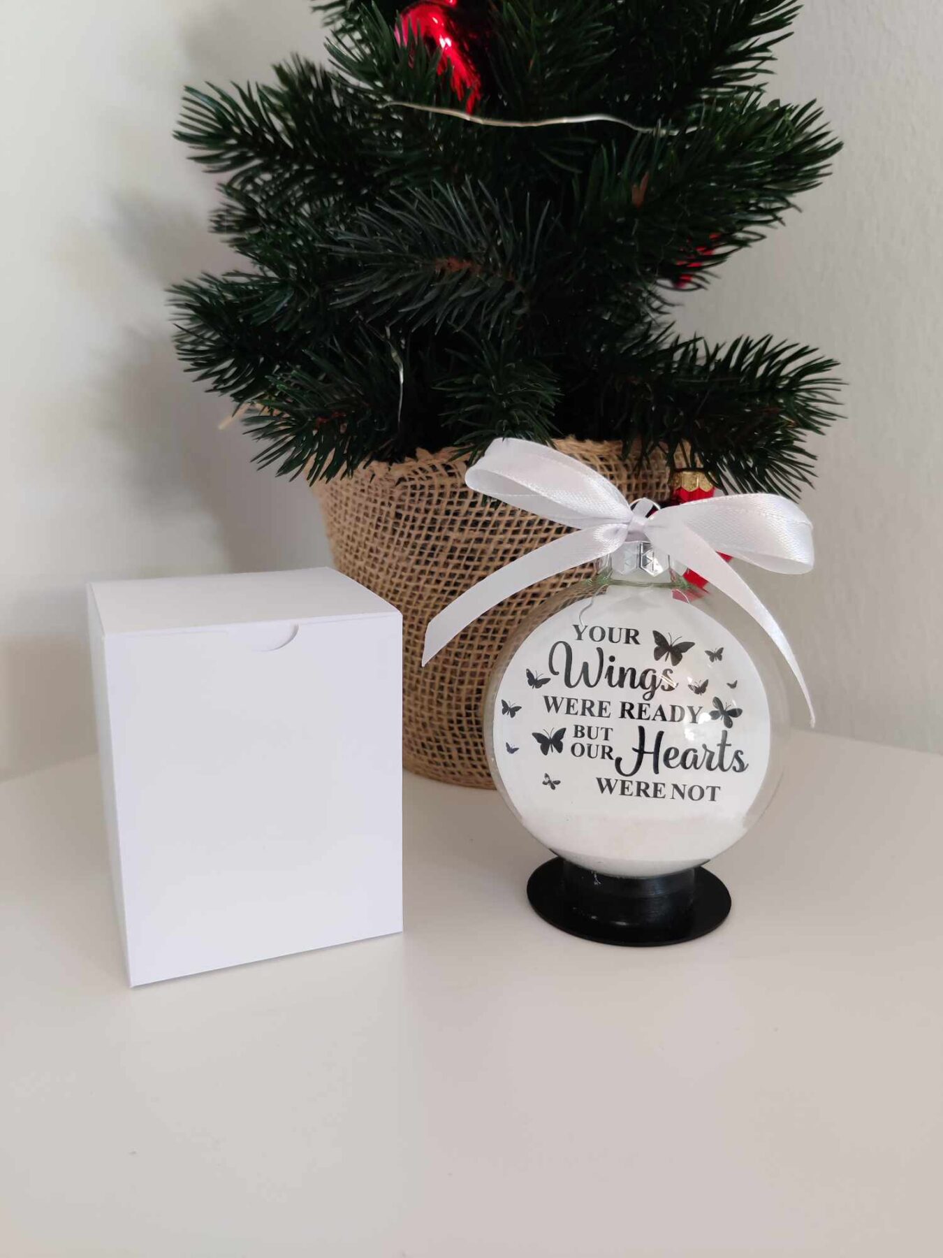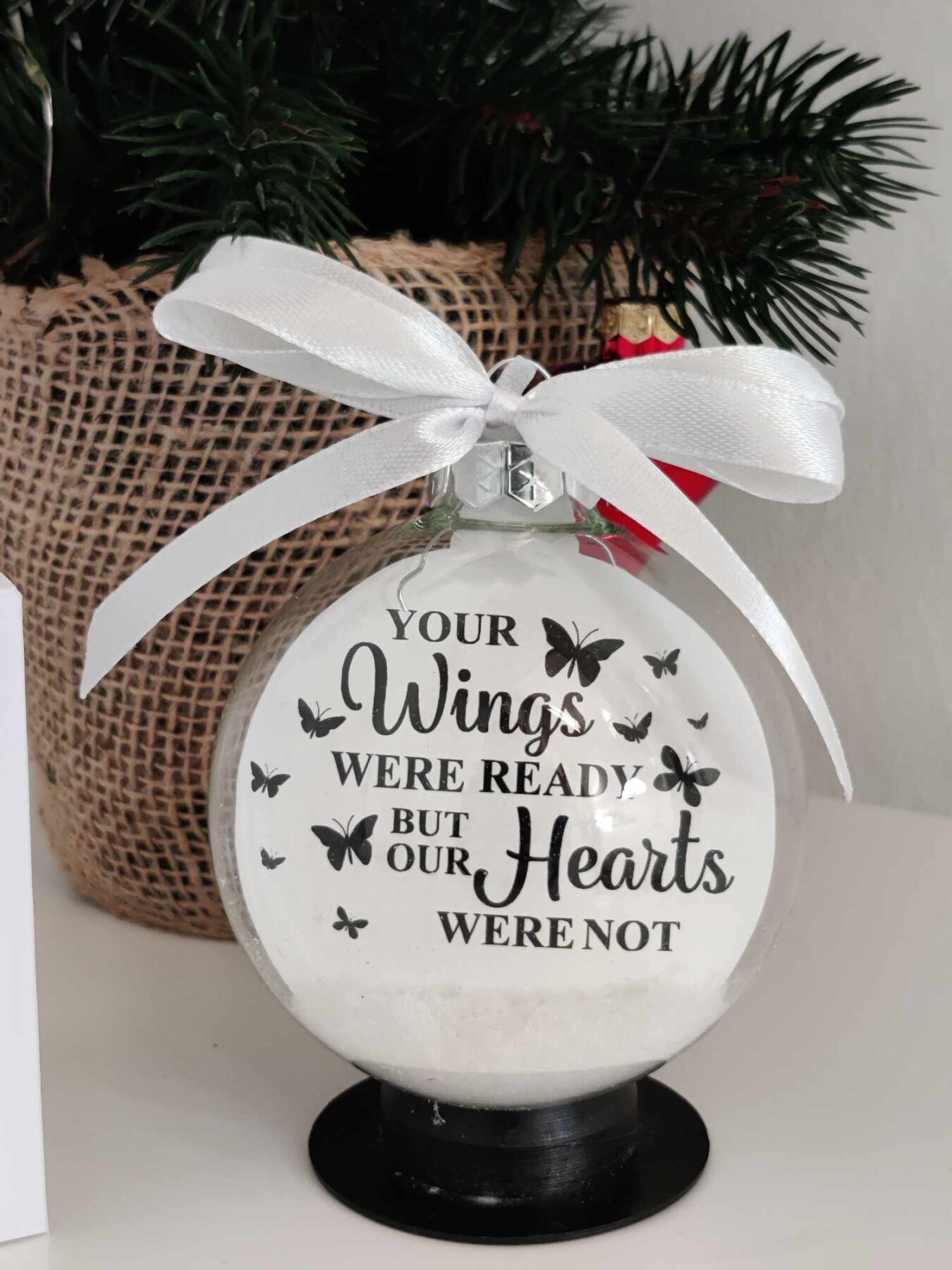 Det søde minde citat som er sat ned indvendig i kuglen, fuldendes med sne i bunden af kuglen og en lille håndbundet sløjfe i ophænget.