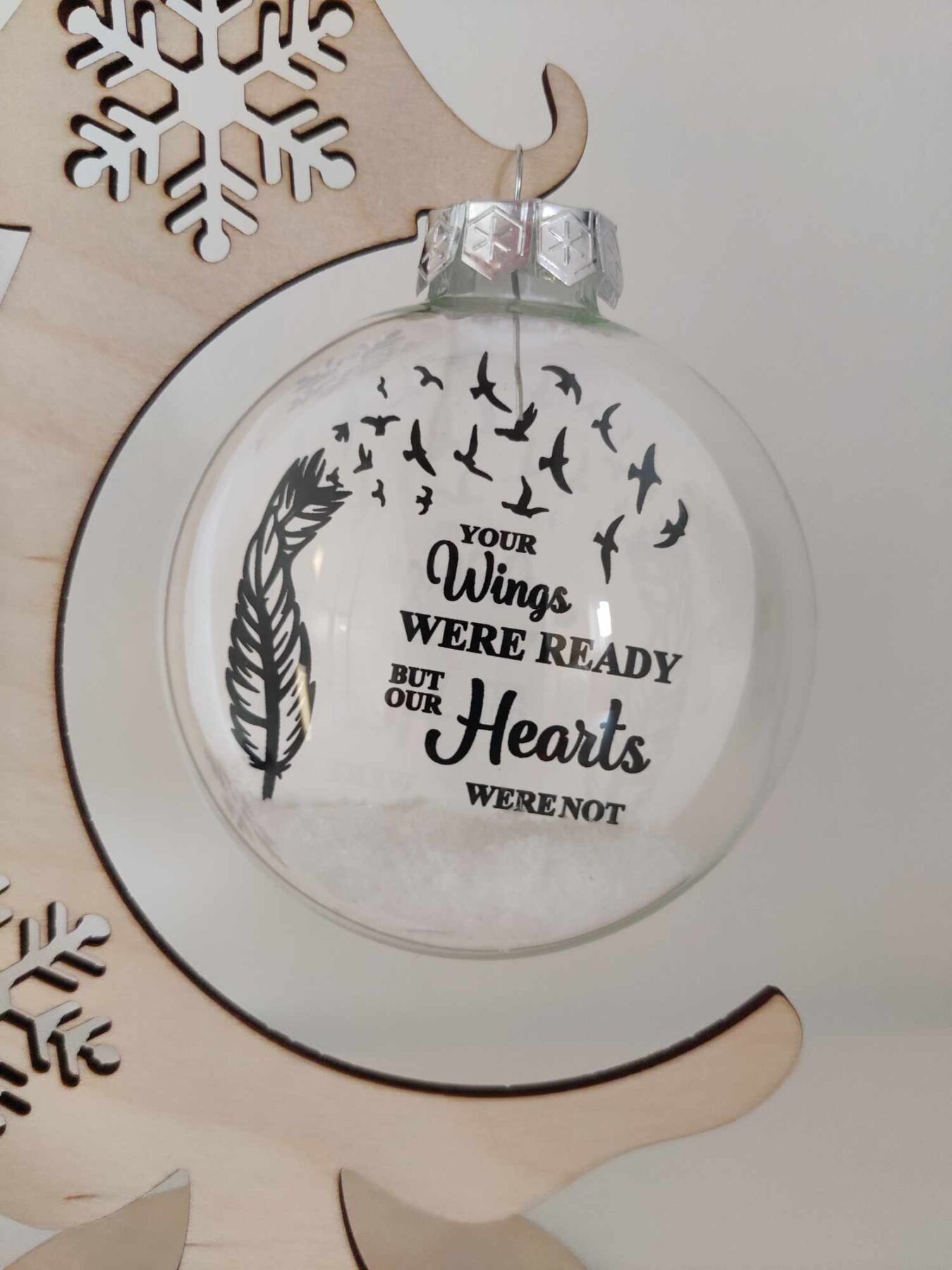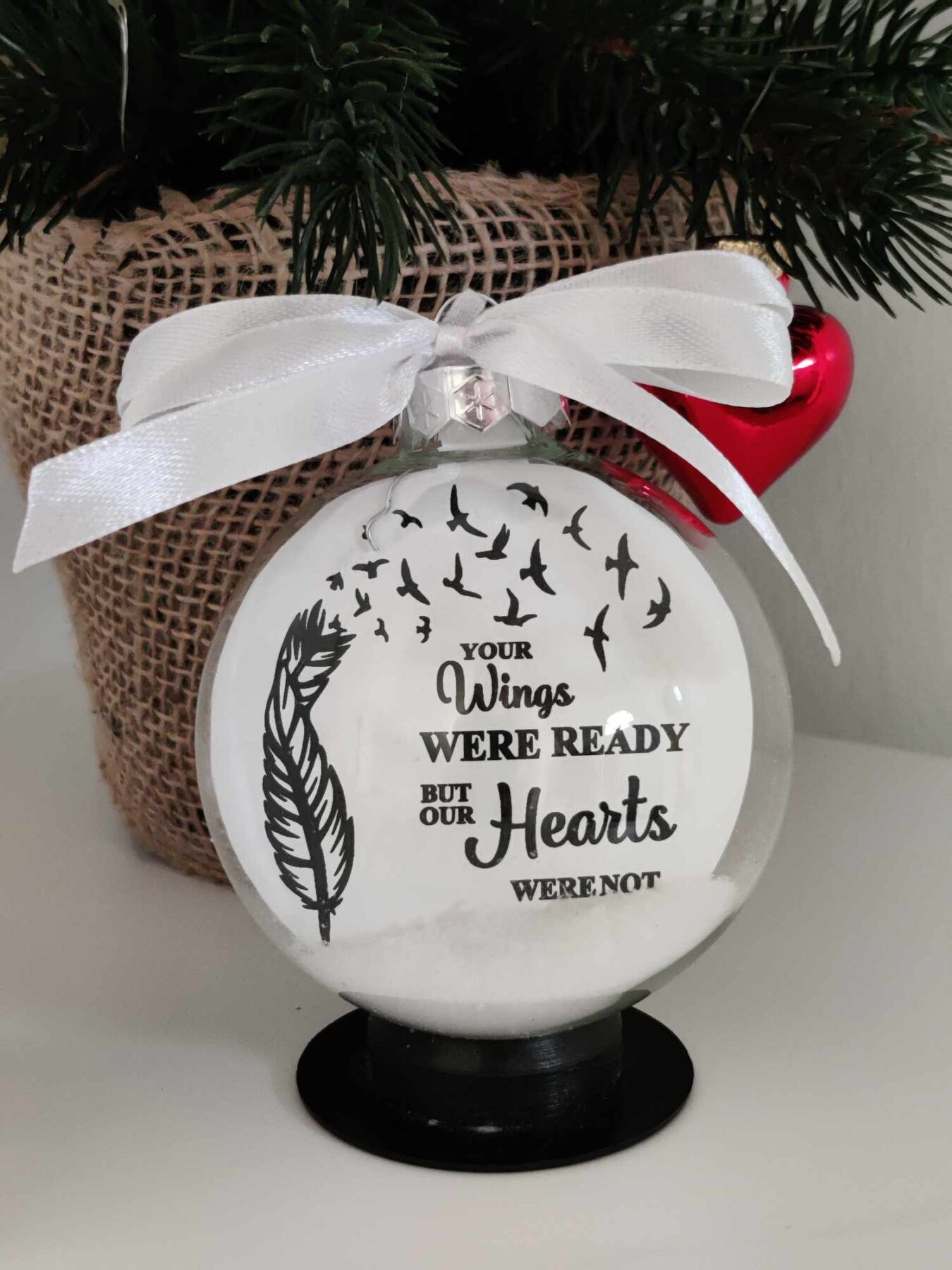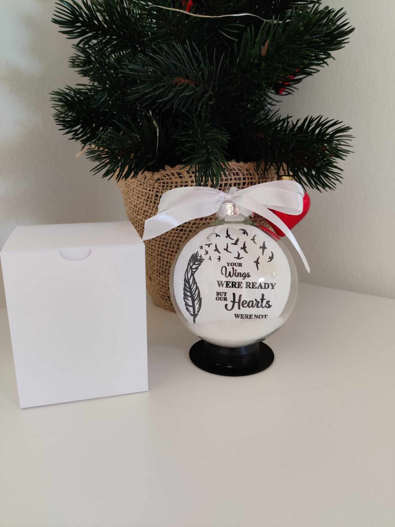 Det søde minde citat som er sat ned indvendig i kuglen, fuldendes med sne i bunden af kuglen og en lille håndbundet sløjfe i ophænget.