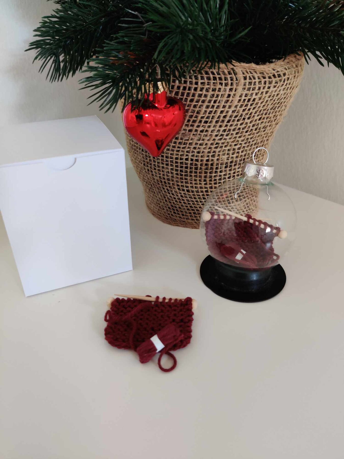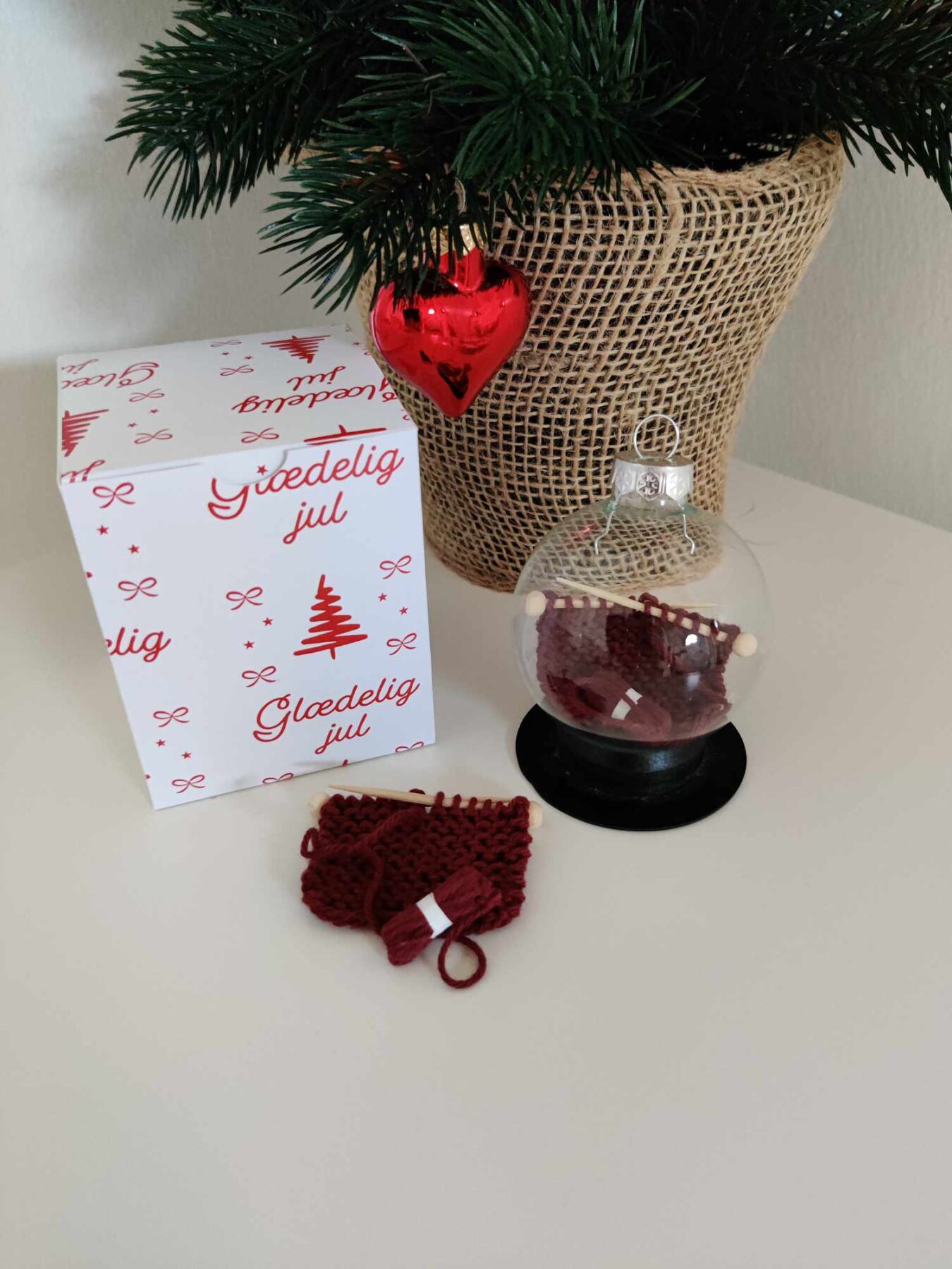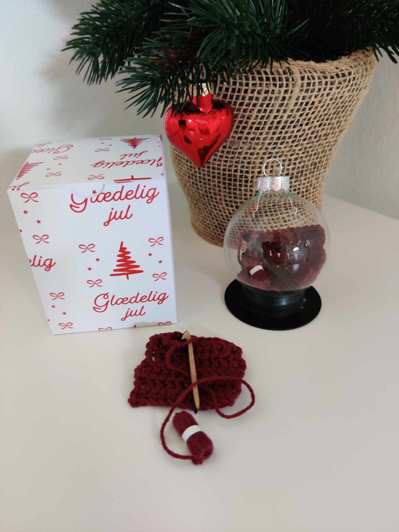 Julekugle med igangværende strikketøj eller hækletøj er den perfekte dekoration i hjemmet hos den strikke/hækleglade.