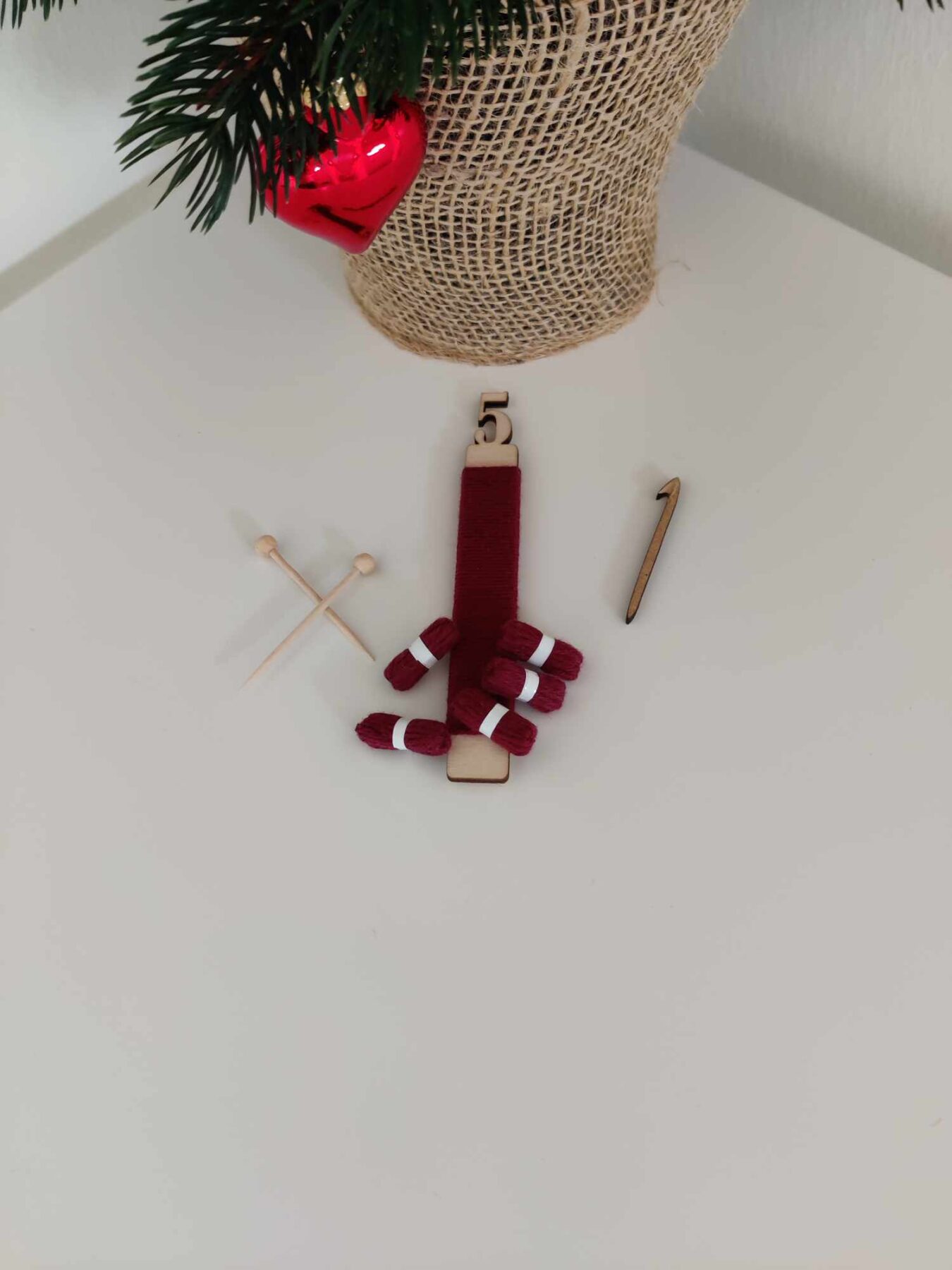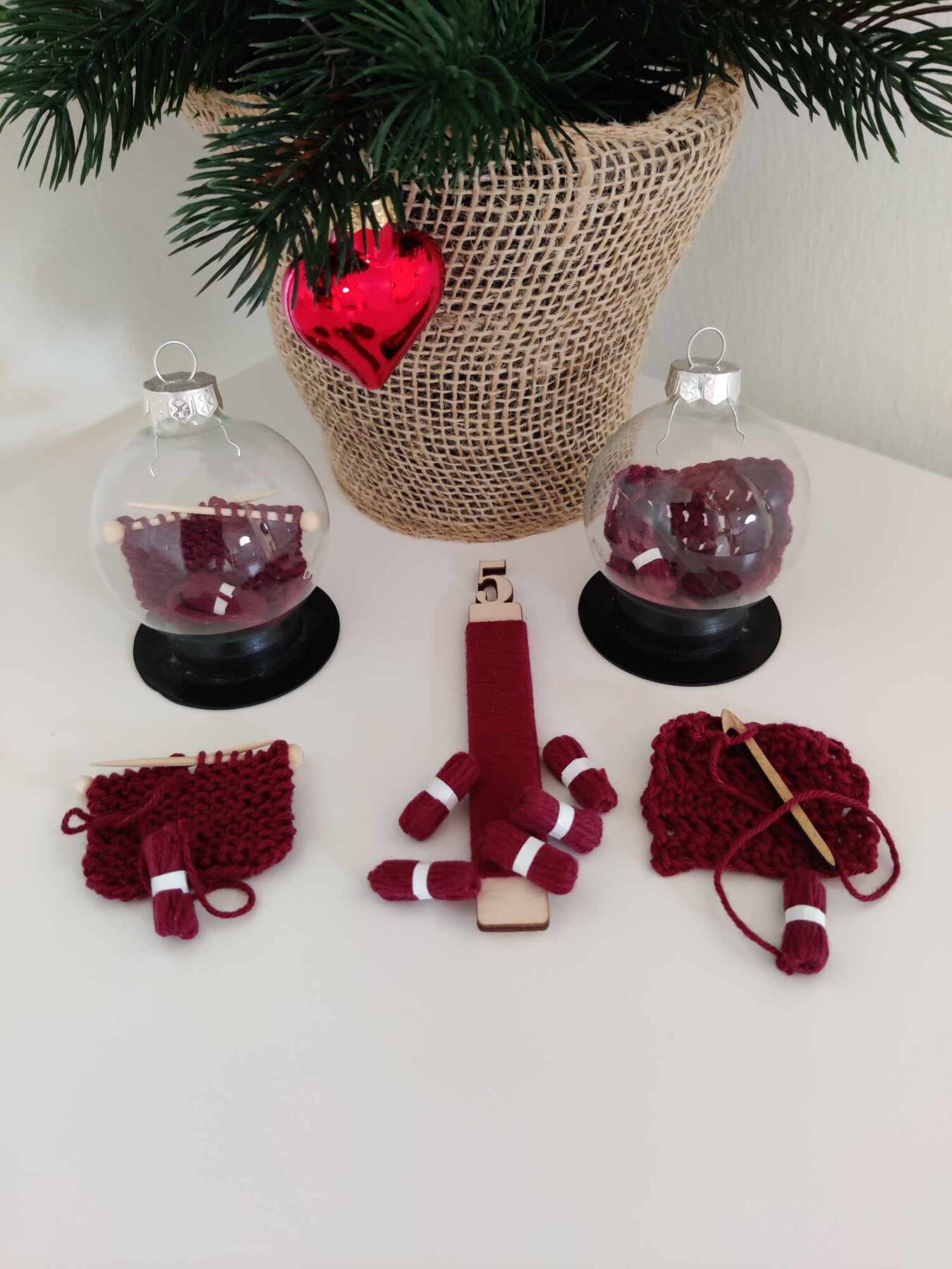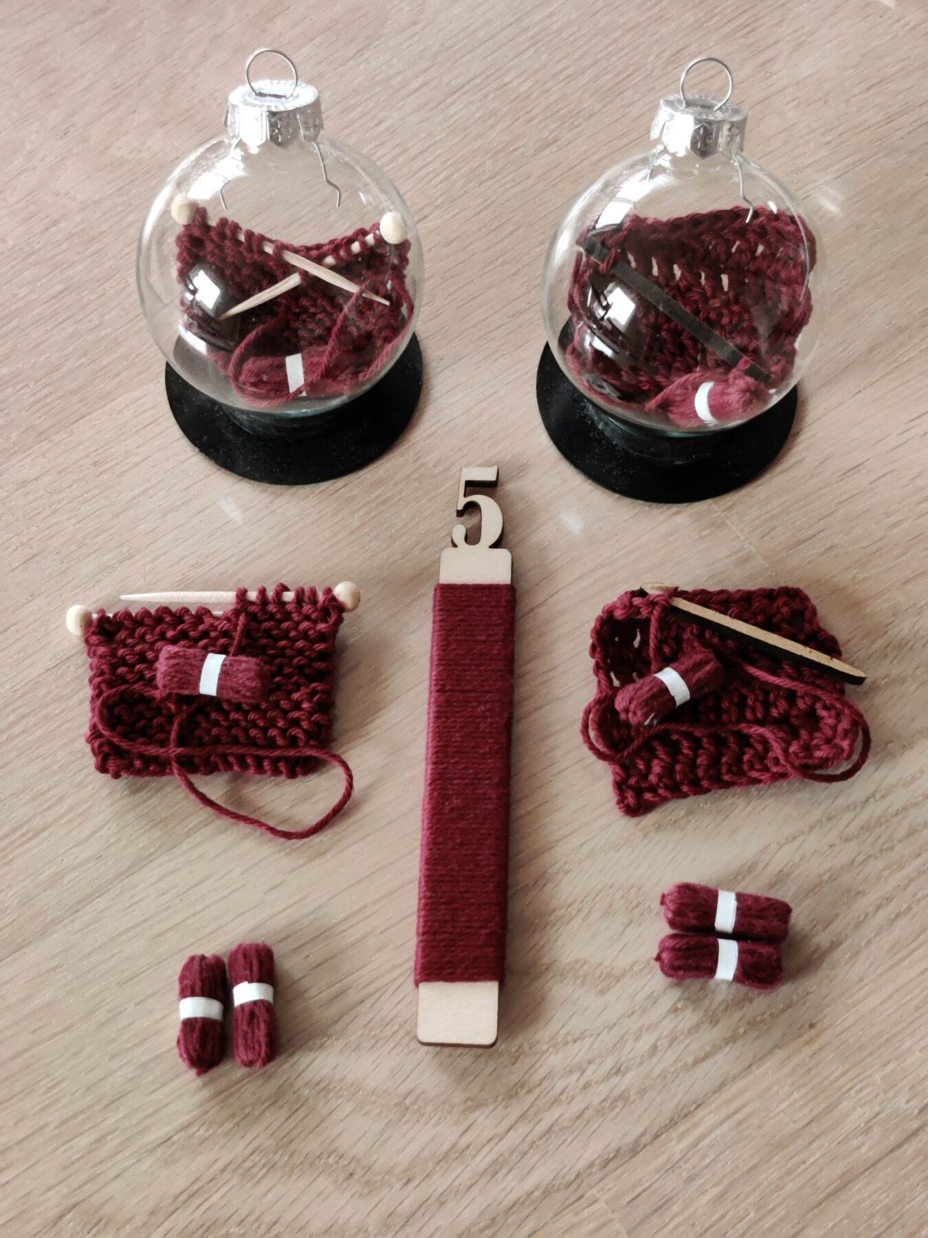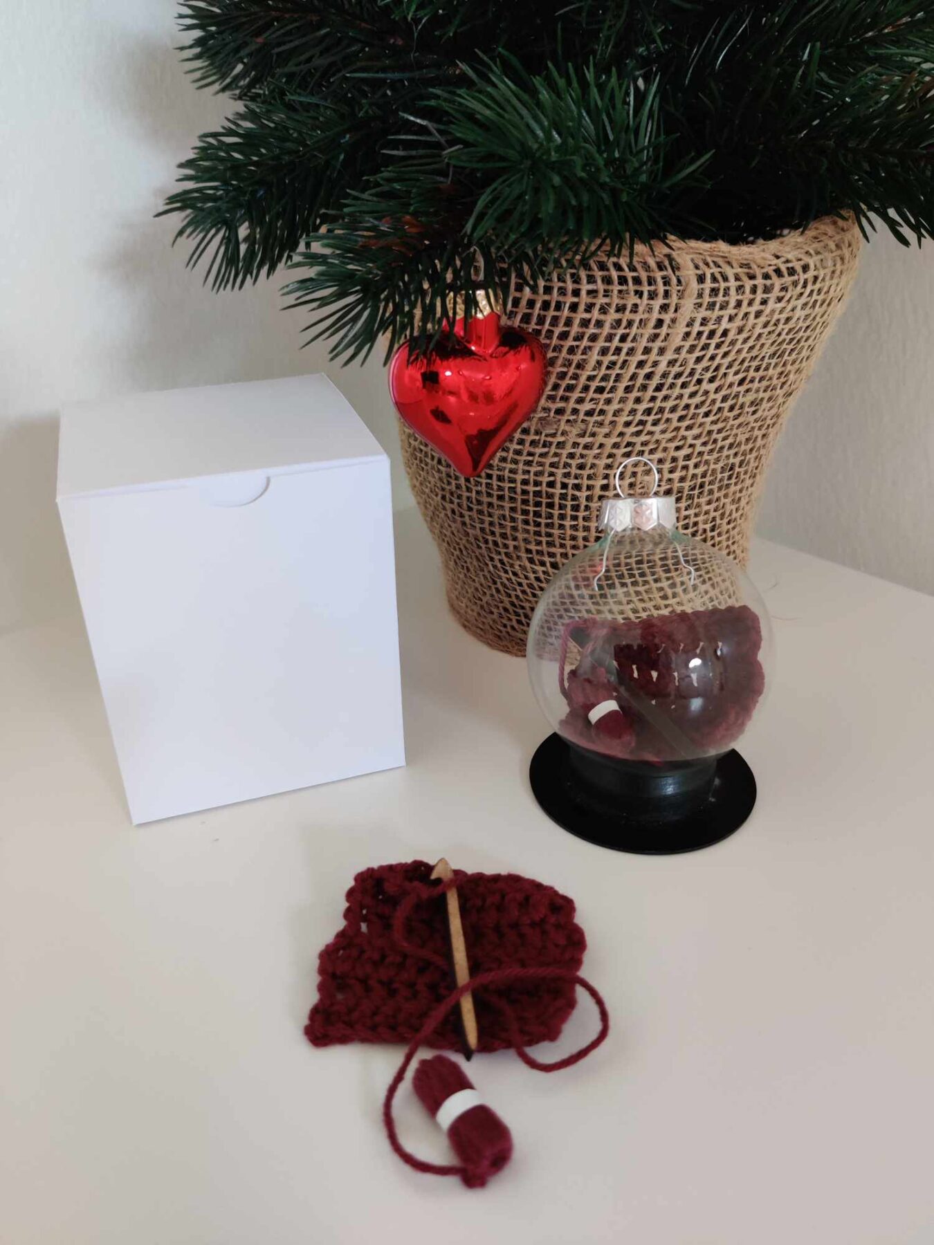 Julekugle med igangværende strikketøj eller hækletøj er den perfekte dekoration i hjemmet hos den strikke/hækleglade.