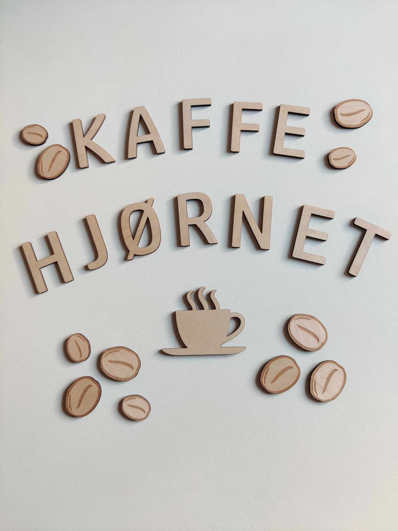 Kaffehjørnet i blokbogstaver – med kop og 11. stk kaffebønner