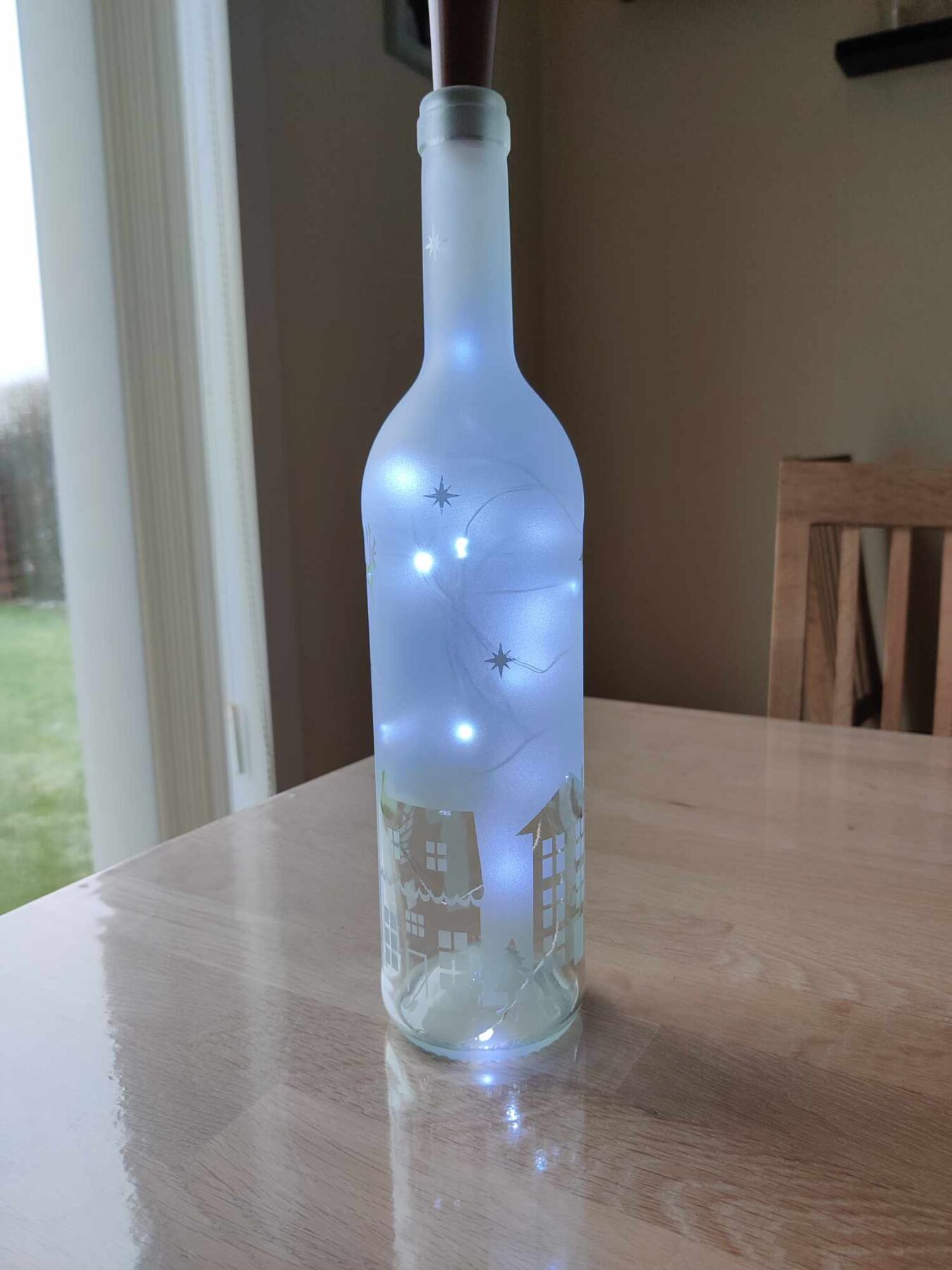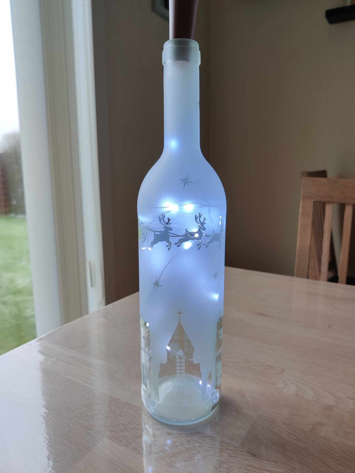 Lys flaske med julemotiver i form af huse, julemand i kane med rensdyr og stjerner giver en hyggelig julestemning.