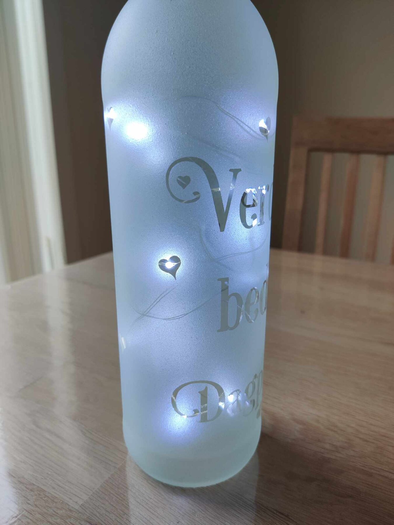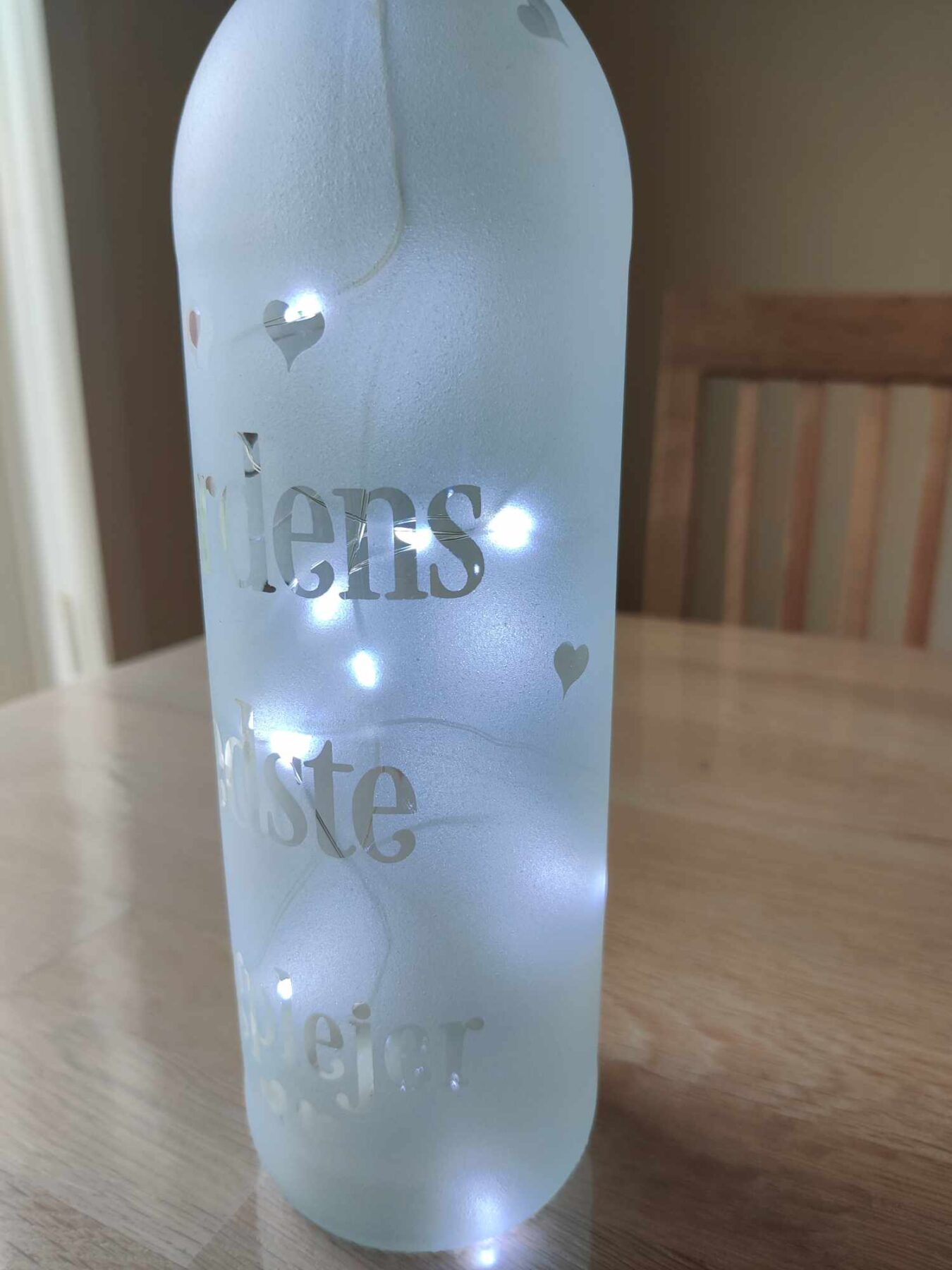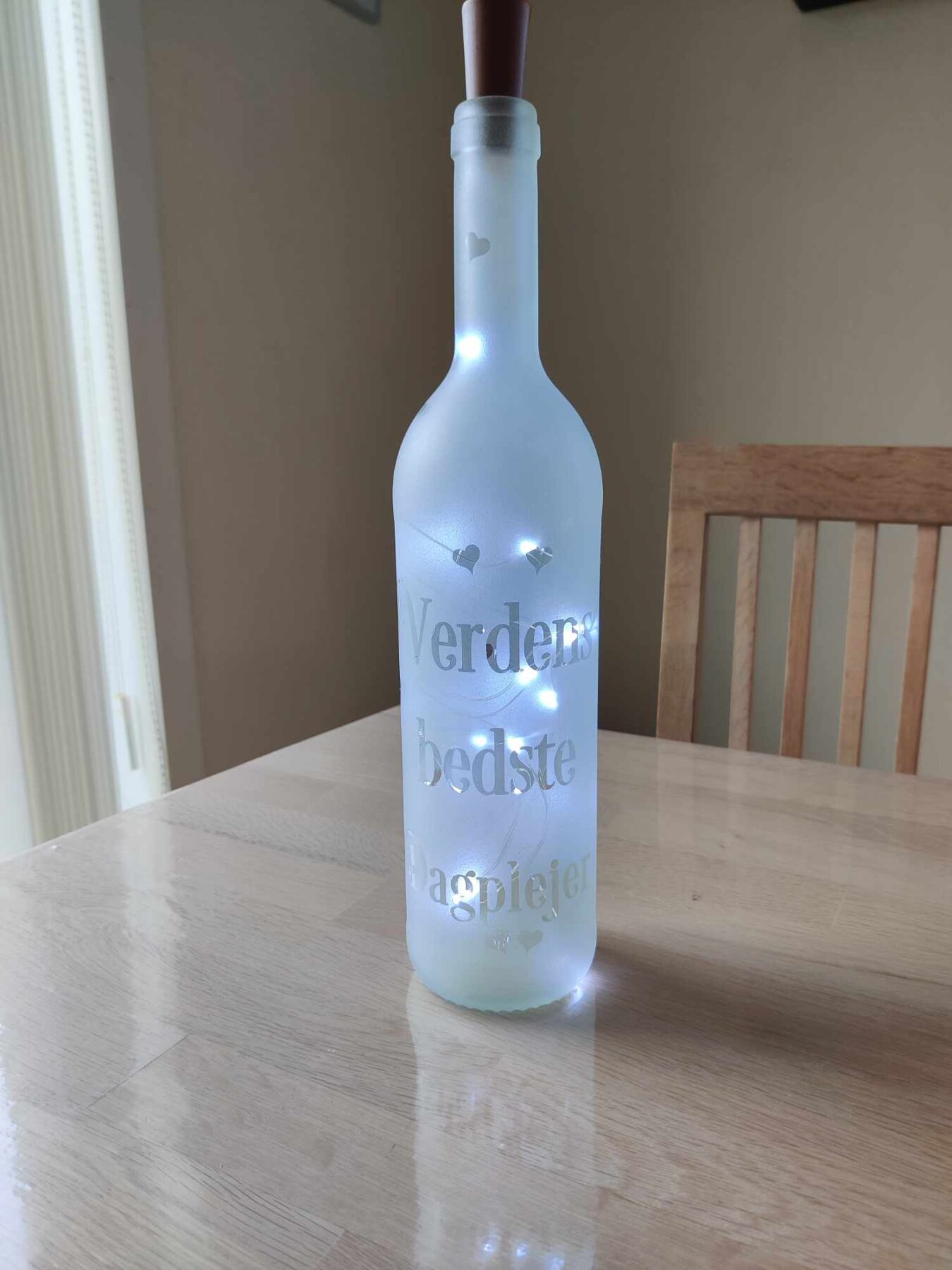 Lys flaske med teksten “Verdens bedste Dagplejer” og små hjerter.