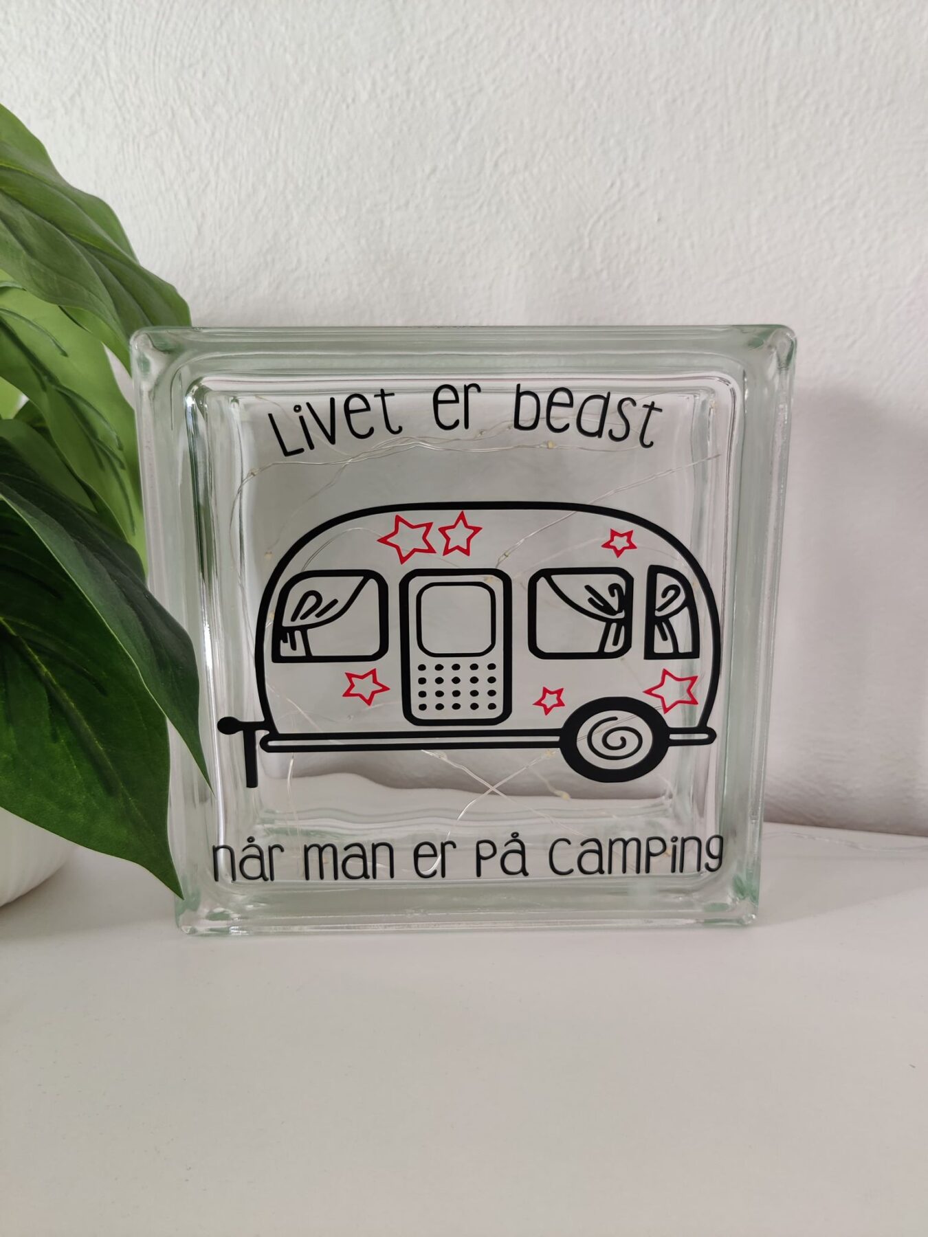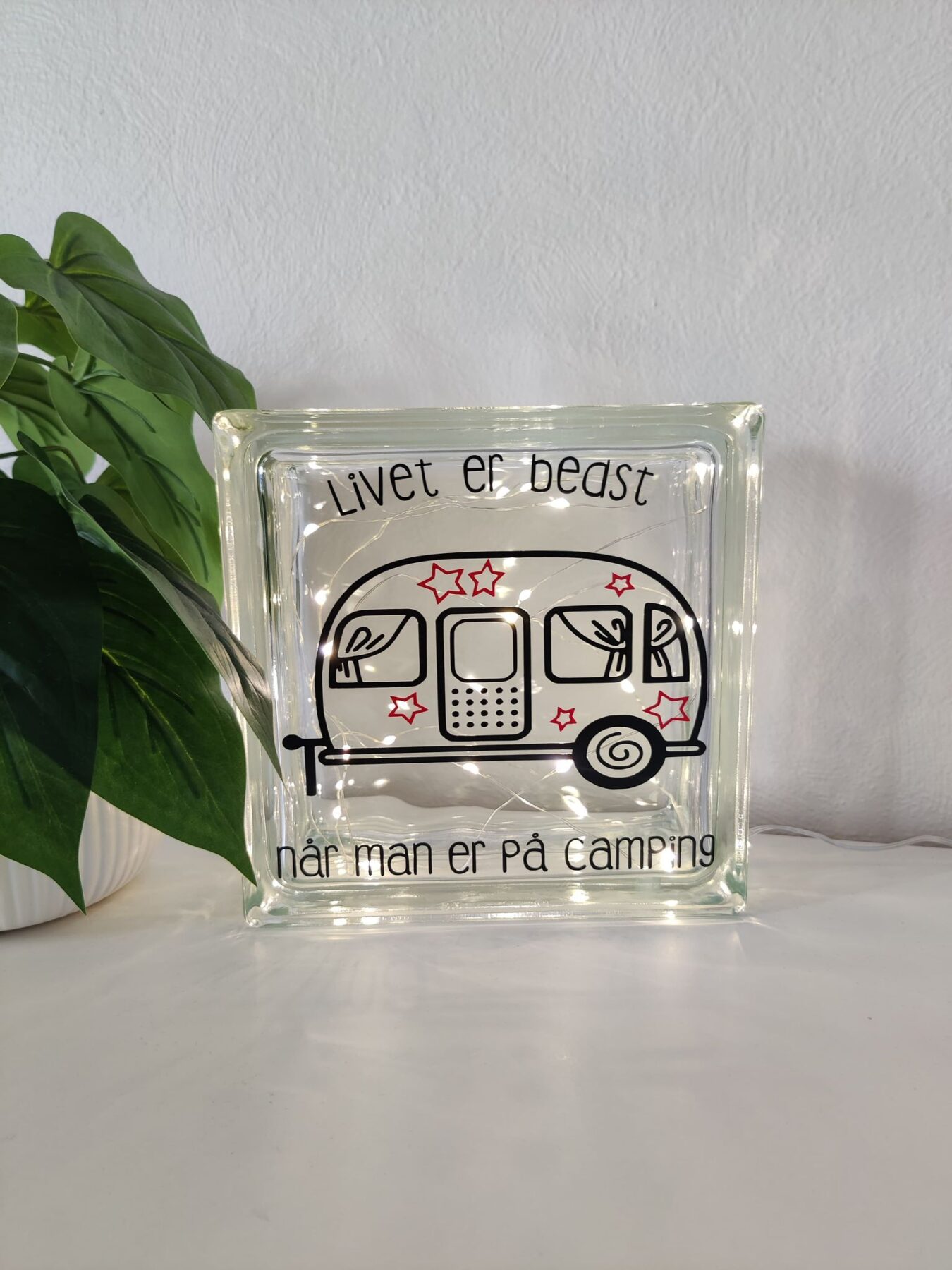 Enkel og elegant lyssten i glas med camping citat. Denne lyssten skaber en hyggelig belysning og er perfekt til de tusmørke timer i campingvognen.