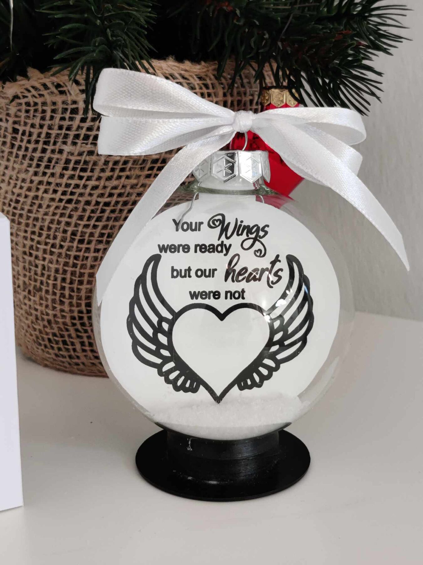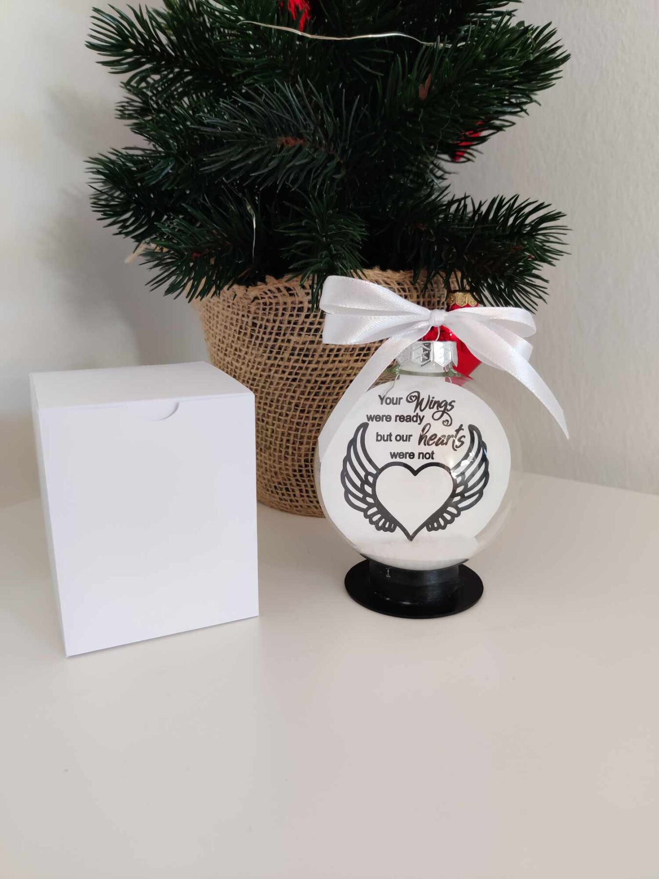 Det søde minde citat som er sat ned indvendig i kuglen, fuldendes med sne i bunden af kuglen og en lille håndbundet sløjfe i ophænget.