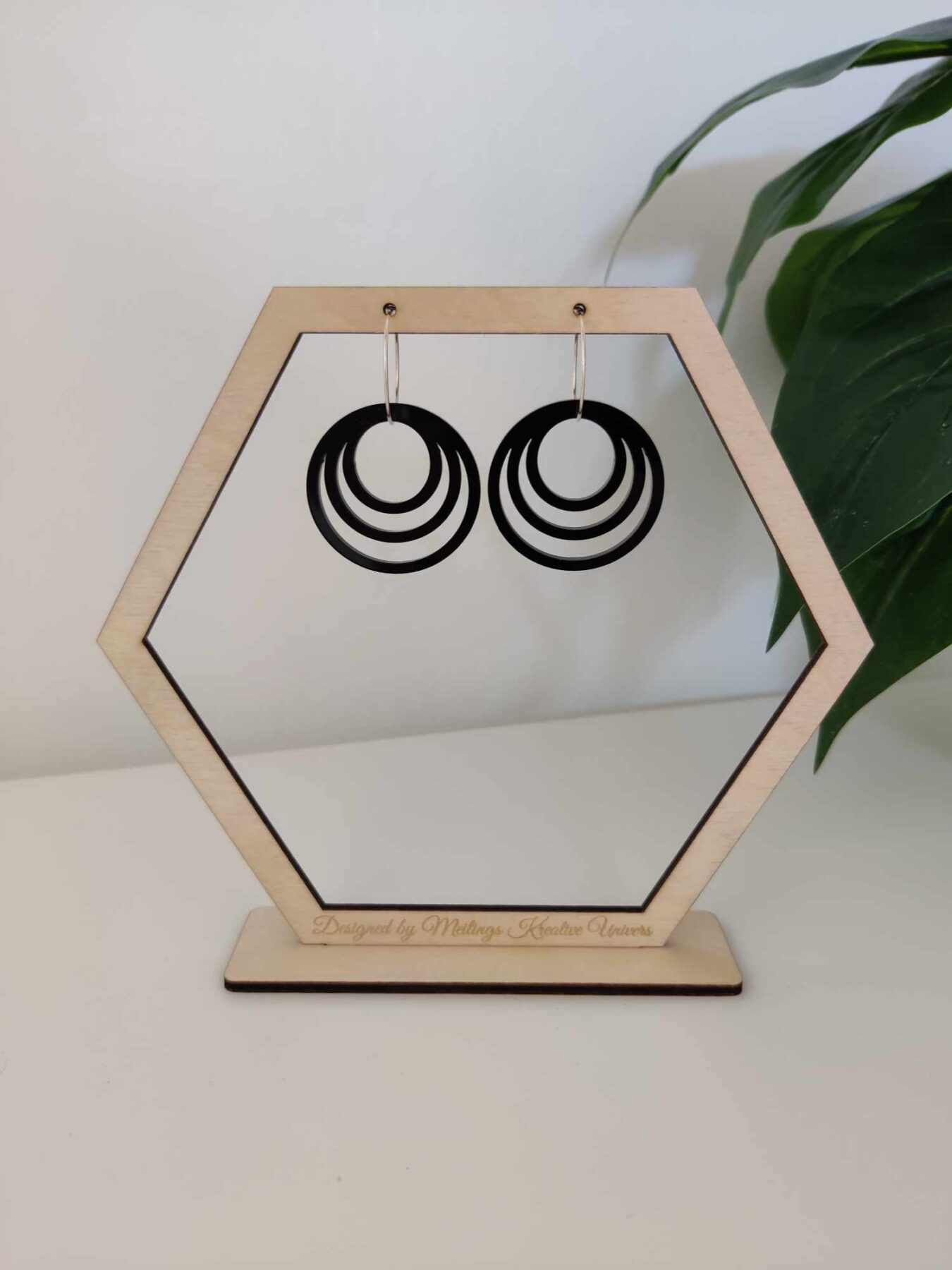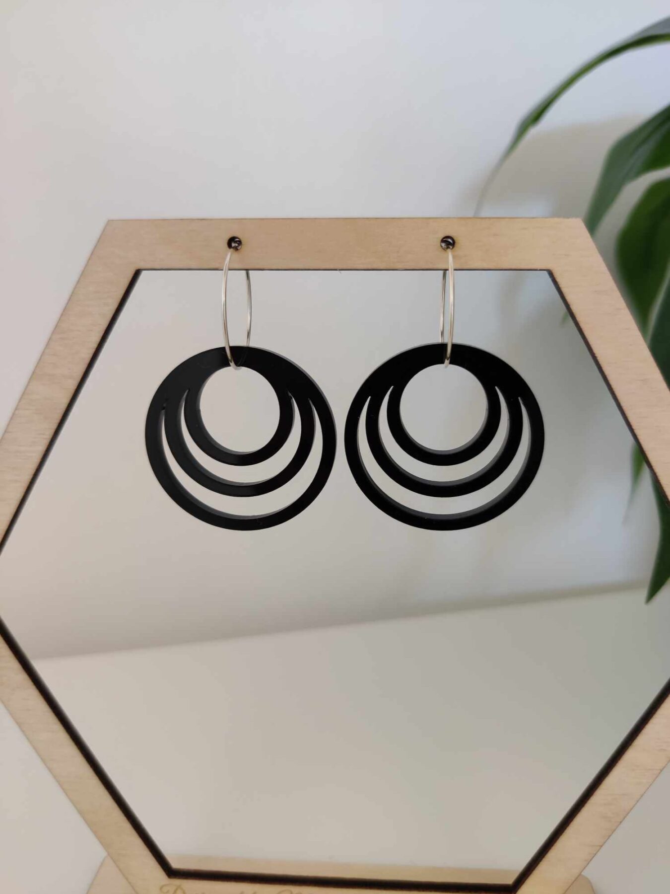 Disse unikke øreringe er lavet i sort akryl, og passer derfor til alle typer af outfit og kan bruges til hverdag, såvel som til festlige lejligheder.